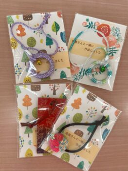作成したキーホルダーやヘアゴムなどは、展示をご覧になった方に自由にお持ち帰りいただきました。